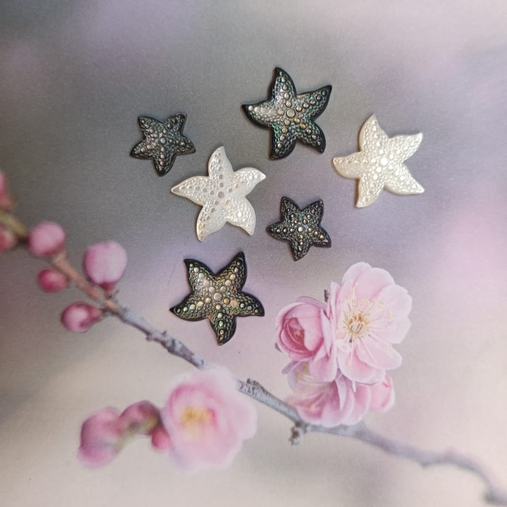 De stervorm benadrukt de natuurlijke schittering van het parelmoer en zorgt voor een speelse, maritieme elegantie.