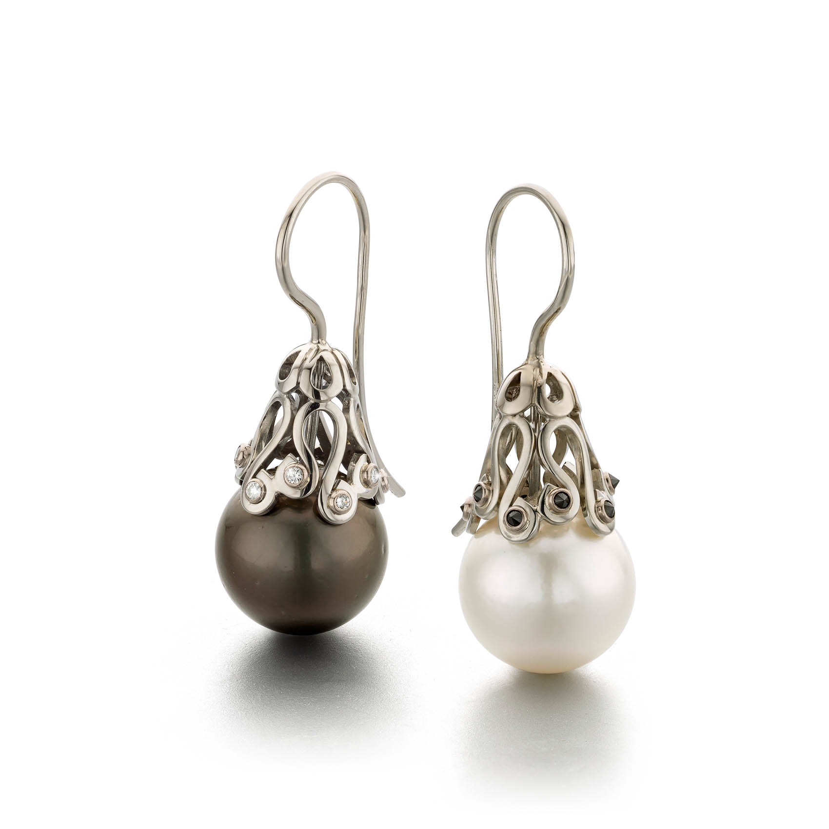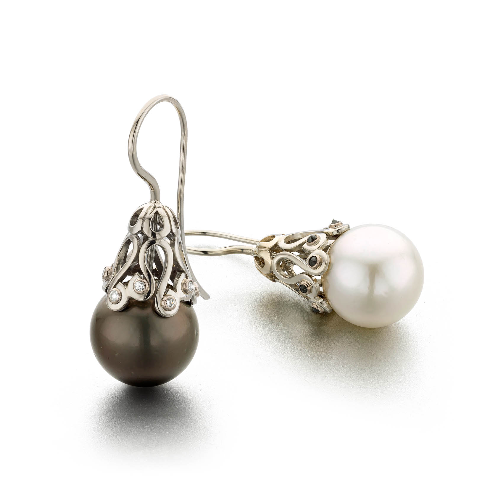 De Tahiti-parel is gezet met 10 witte diamanten, de Zuidzee-parel met 10 zwarte diamanten. De diamanten wegen samen 0.30 ct. Het contrast tussen donker en licht geeft deze oorbellen een uitgesproken karakter.